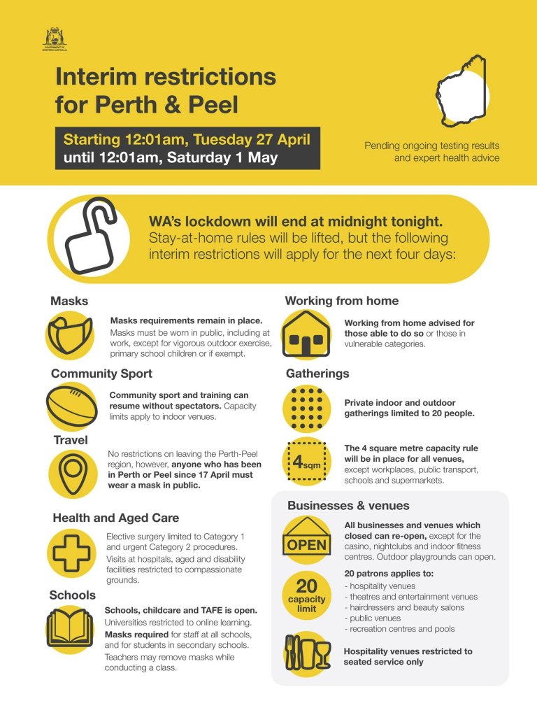 People in perth and the peel region required to stay home for three days after coronavirus spread from hotel quarantine to community. Hospitality, entertainment venues including casino. Check our guide to western australia's covid lockdown restrictions. Mask wearing and other measures to be rolled back. Everything you need to know about masks & more.